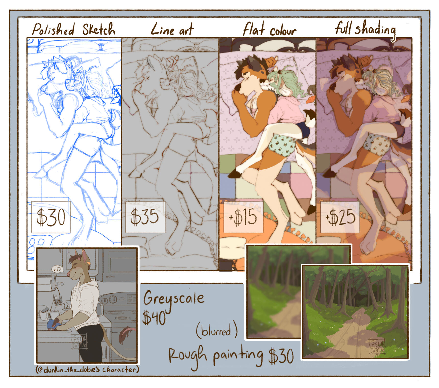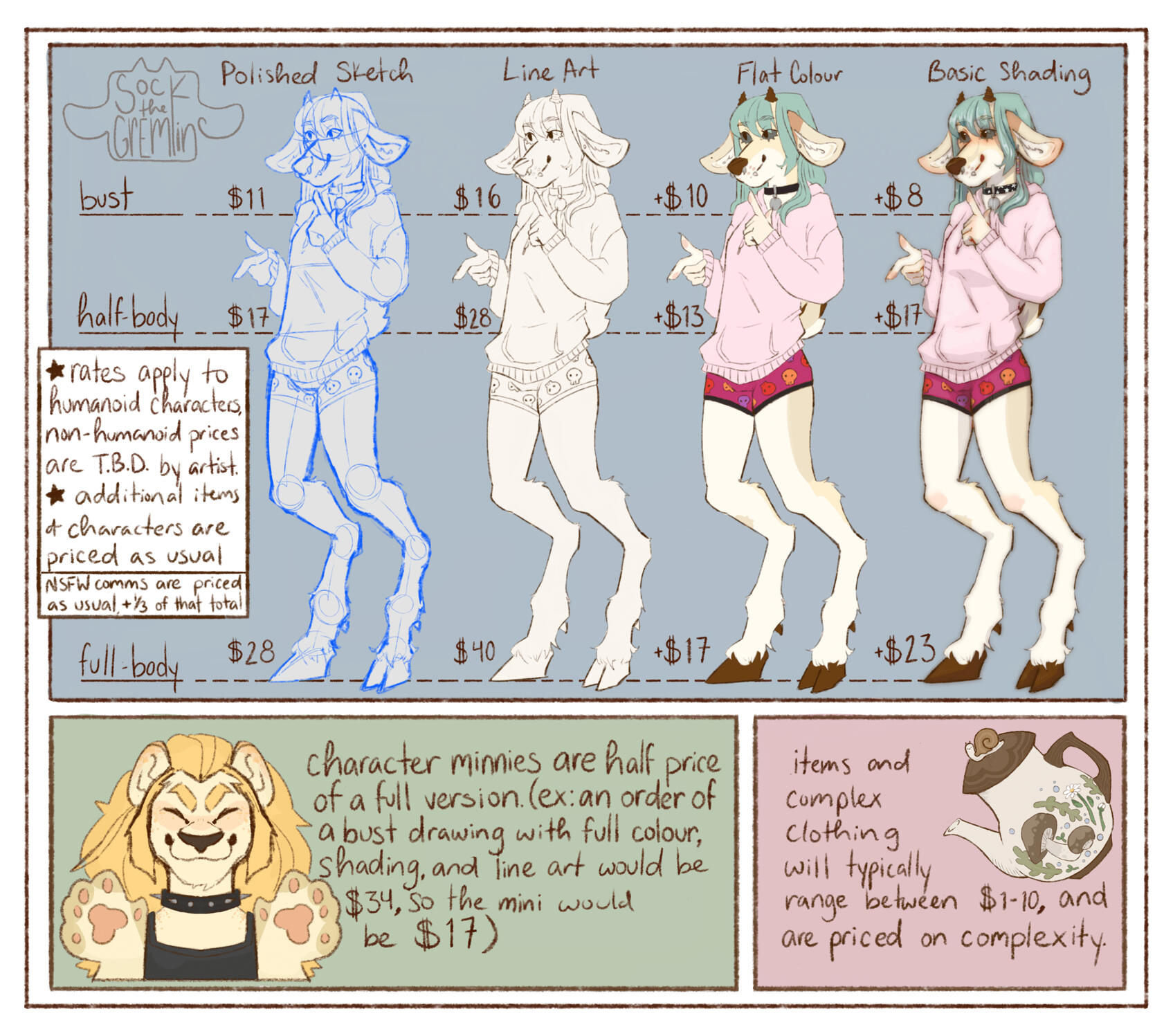 As my commissions are taken via kofi, all prices displayed there. The link to my kofi may be located on the home page of my card. :-)